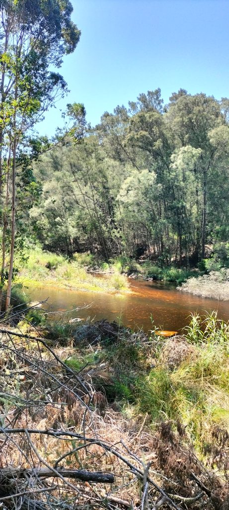 Unfortunately what we encounter here is perhaps one of the last stretches of this river that is not heavily infested with alien vegetation. On 11 January 2026 we drove up the R339 and made our way down to the river about 5 km before the turnoff to Diepwalle. Here alien vegetation abounds, including forests of Eucalyptus, some of them up to 50m tall. A 3-year-old Eucalyptus might use 20 liters/day, while a 20-year-old could use 200 liters/day – and up here there are literally tens of thousands of them, plus Black Wattle and other aliens. We found the river to be extremely shallow at present – the combined effect of the drought and the AIS infestation of the catchment.