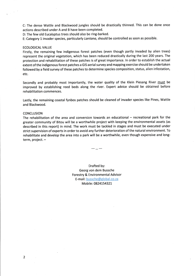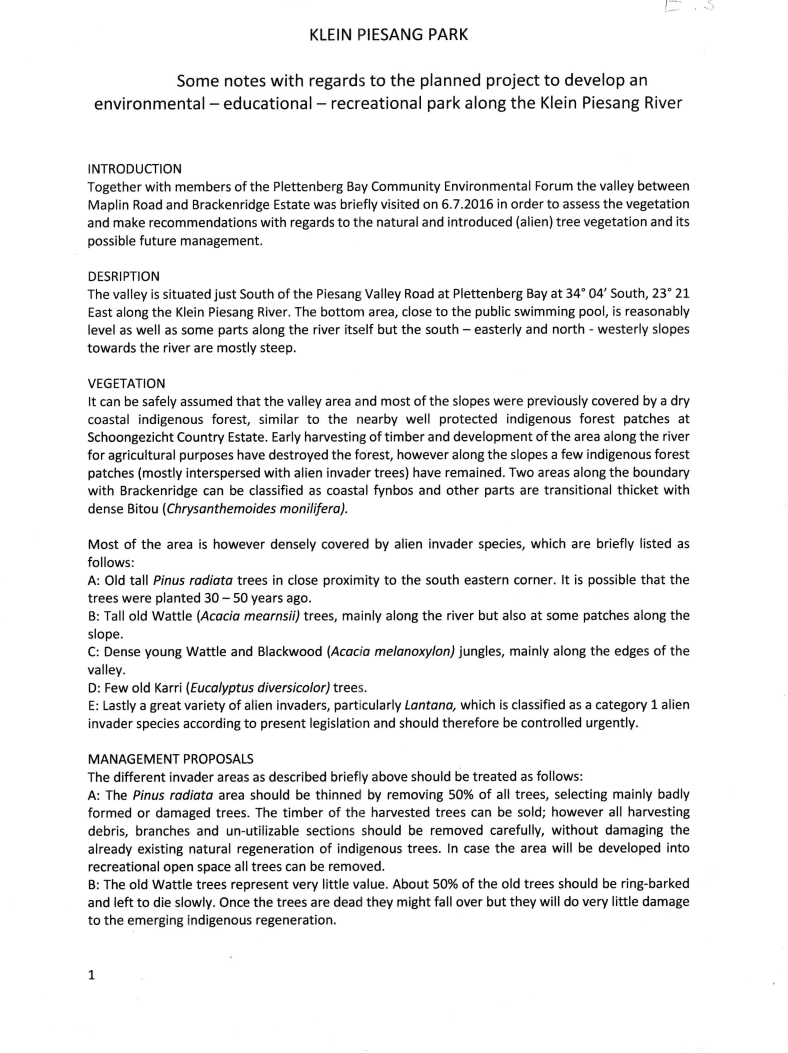 The idea to rehabilitate and develop the Klein Piesang River Valley into a Nature Park was first muted in 2016. In order to get a better understanding of the area’s potential and the challenges which a successful rehabilitation program might pose, the Plett Environmental Forum decided to ask a scientifically qualified specialist to do a survey and draft a brief report.